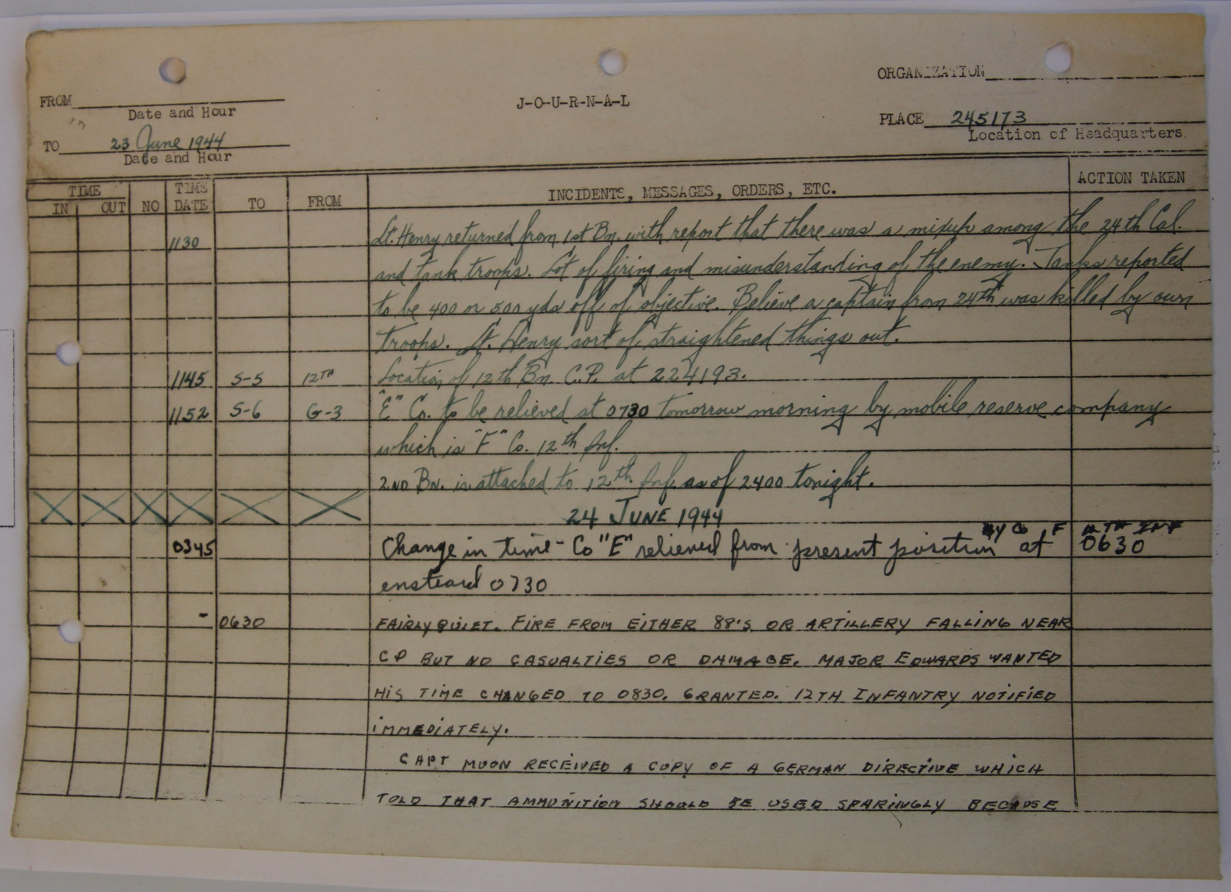 Transcription: Lt. Henry returned from 1st Bn. with report that there was a mixup among the 24th Cav. and tank troops. A lot of firing and misunderstanding of the enemy. Tanks reported to be 400 or 500 yds off objective. Believe a captain from 24th was killed by our troops. Lt. Henry sort of straightened things out.