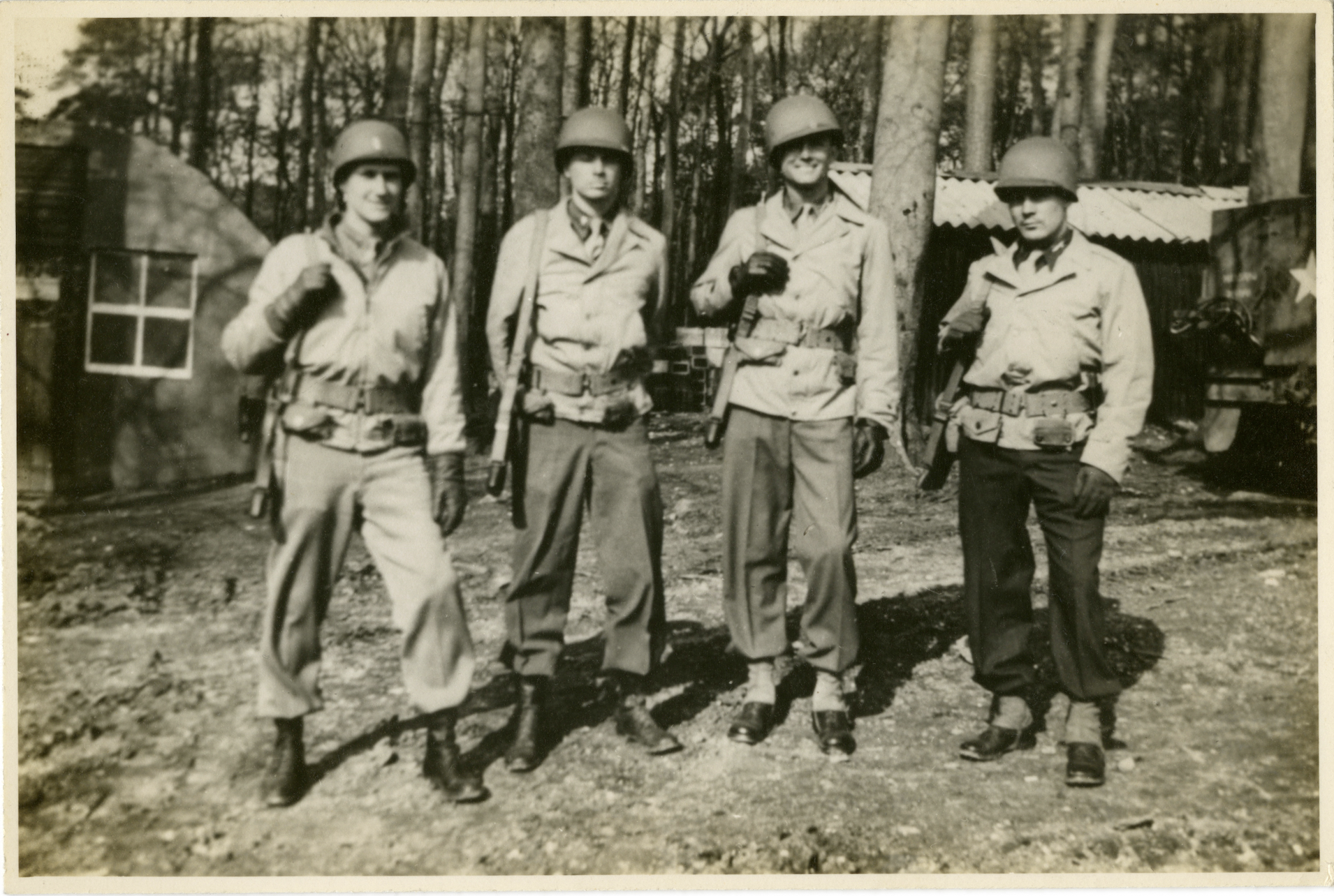 Güntersberge, Germany, May 1945. Captioned: In the drive to my house with Sgts. Stewart, McMahon, and Watters. Güntersberge May 45 – First time in dress uniform since April 44