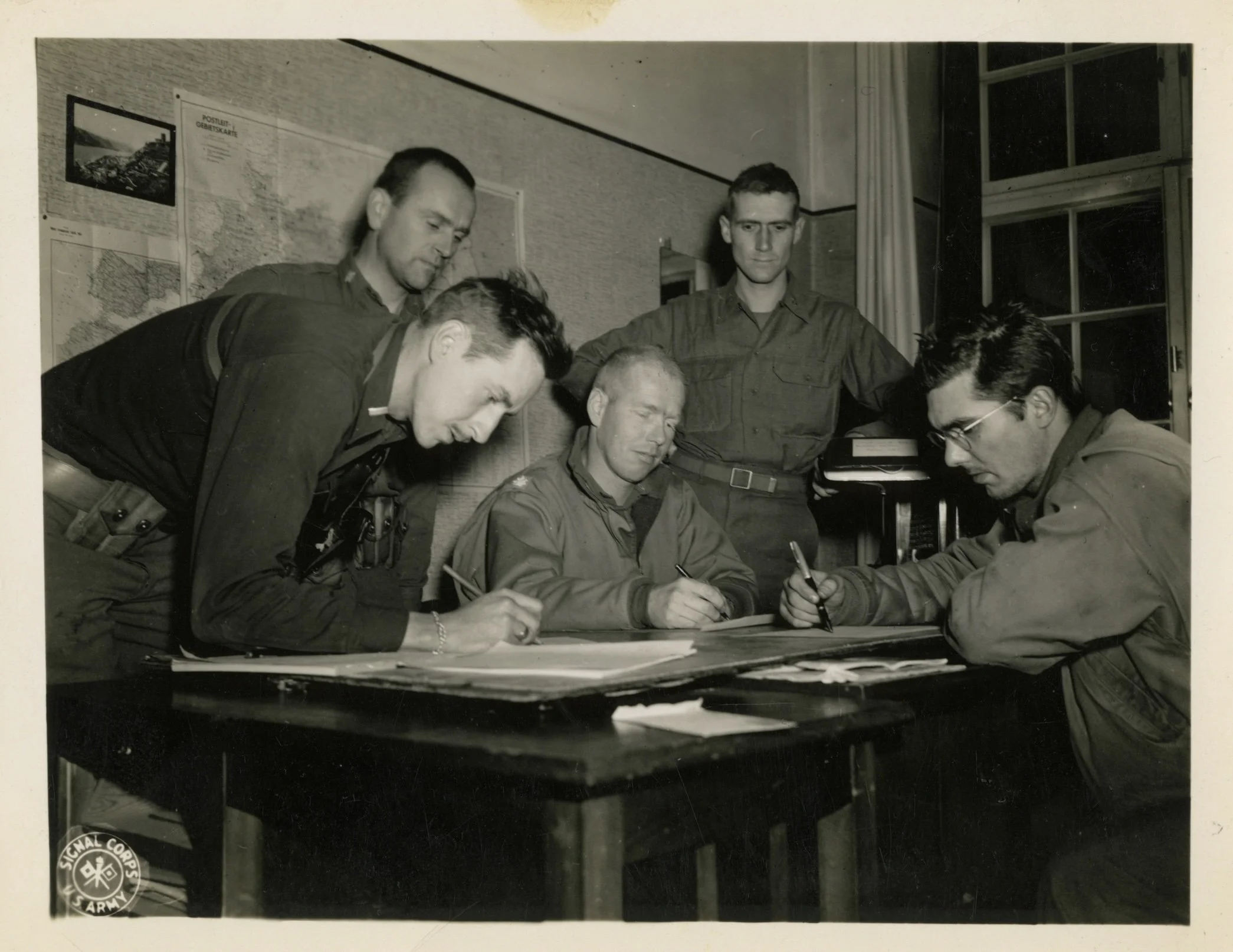 Lt. Col. Frederick Harold Gaston Jr photographed in a command post meeting by the Signal Corps on November 10 1944, in Eupen, Belgium. This photograph was supplied by Tom Averett, son of Capt. Elliott Averett Jr (pictured standing in the corner).